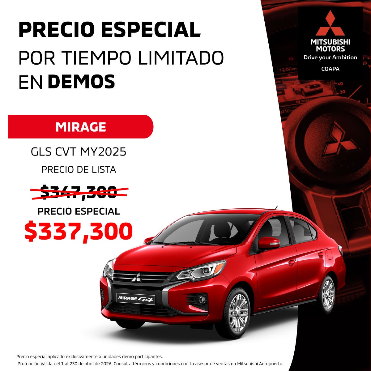El precio mostrado es el precio especial aplicado a la unidad demo. Válido únicamente para Mitsubishi Mirage GLS CVT MY2025 en calidad demo.