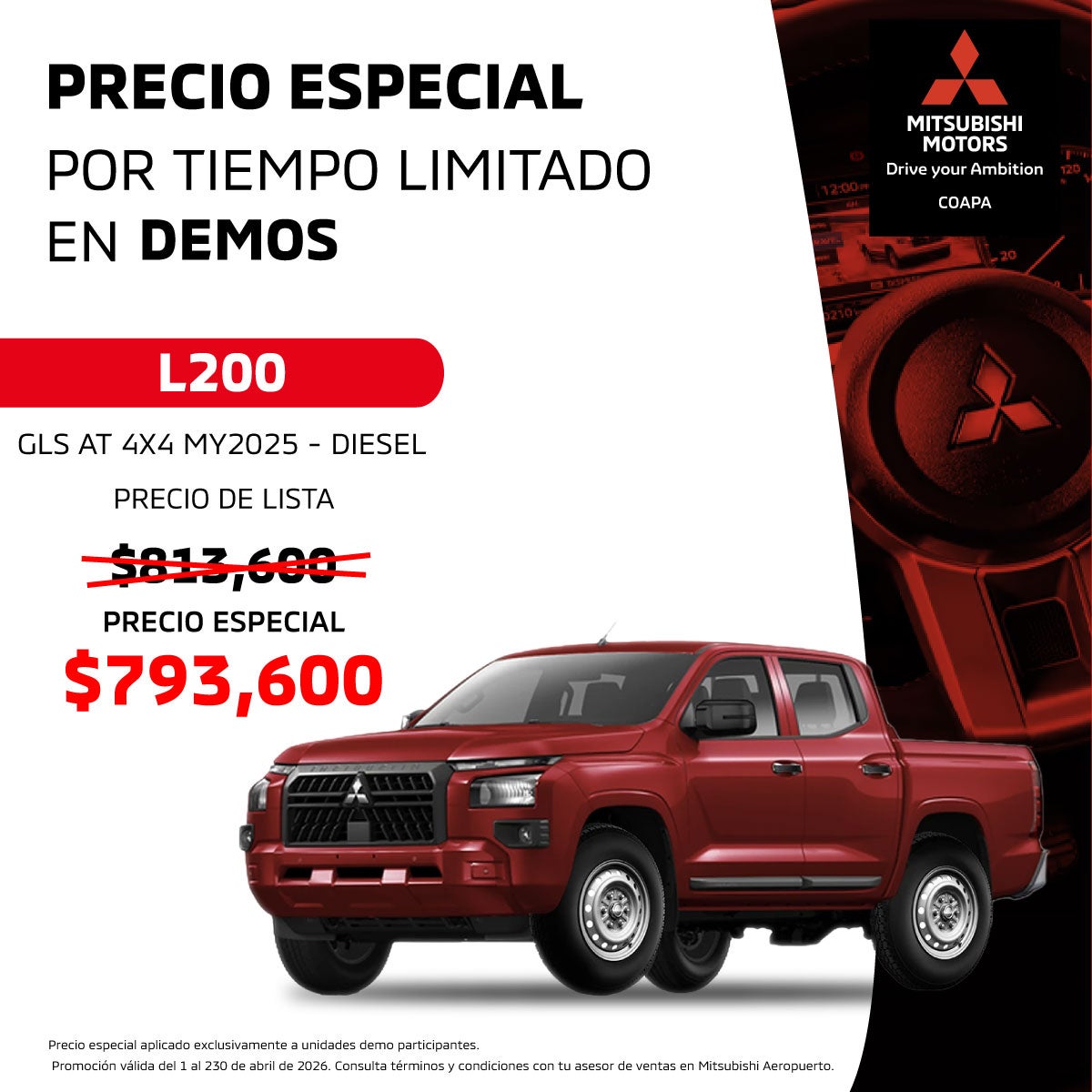 Precio especial aplicado exclusivamente a unidades demo participantes. Válido únicamente para Mitsubishi L200 GLS AT 4x4 MY2025 Diésel en calidad demo.