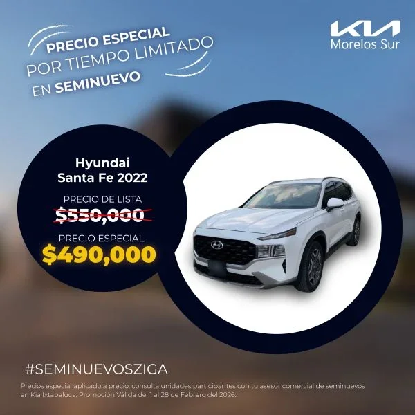 Oportunidad única por tiempo limitado. Adquiere la Hyundai Santa Fe 2022 seminueva, una SUV familiar premium que ofrece espacio generoso, tecnología avanzada y confort excepcional. Con un precio especial aplicado, disfruta de un ahorro significativo en un vehículo casi nuevo, certificado y listo para llevar a tu familia con estilo y seguridad.