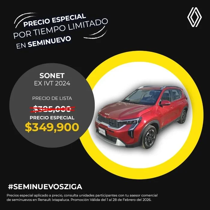 El precio mostrado ya incluye el bono aplicado. Válido únicamente para Kia Sonet EX IVT 1.5 modelo 2024 seminuevo.