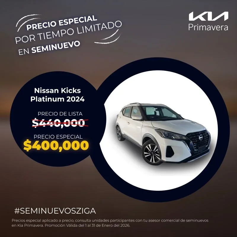 El precio mostrado en inventario ya incluye el bono aplicado. Válido únicamente para Nissan Kicks Platinum modelo 2024 seminuevo.