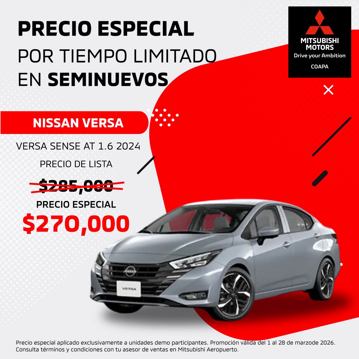 El precio mostrado ya incluye el bono aplicado. Válido únicamente para Nissan Versa Sense AT 1.6 modelo 2024 seminuevo.