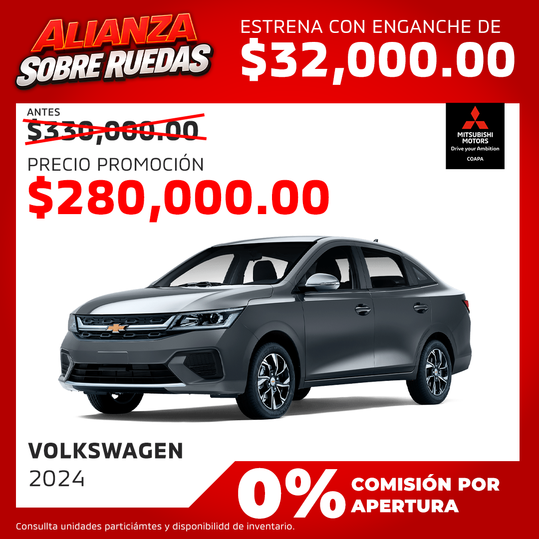 ¡Alianza sobre ruedas! Aprovecha esta oportunidad por tiempo limitado y adquiere un Volkswagen modelo 2024, un vehículo que combina diseño alemán, tecnología y eficiencia. Condiciones exclusivas: enganche desde solo $32,000, precio promoción de $280,000 (antes $350,000) y beneficio adicional de 0% comisión por apertura*. Ideal para quienes buscan calidad, confianza y facilidades de pago.