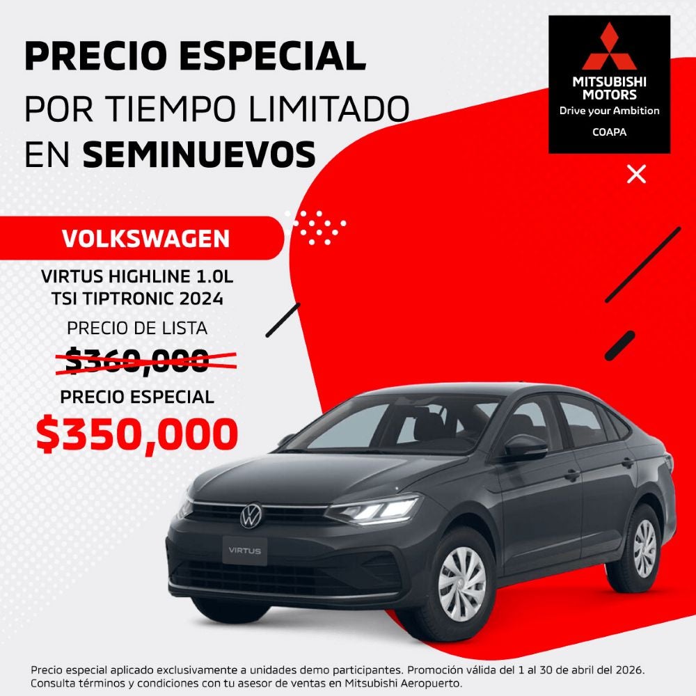 El precio mostrado ya incluye el bono aplicado. Válido únicamente para Volkswagen Virtus Highline 1.0L TSI Tiptronic modelo 2024 seminuevo.