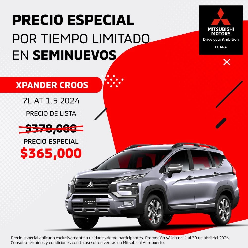 ¡Oportunidad por tiempo limitado! Adquiere la Mitsubishi Xpander Cross 7L AT 1.5 2024, la SUV versátil que combina diseño aventurero, espacio para 7 pasajeros y transmisión automática. Ideal para la familia y los viajes. Aprovecha nuestro precio especial aplicado que reduce el precio de $378,000 a solo $365,000. Versatilidad y confianza Mitsubishi con ahorro inmediato en seminuevo certificado.